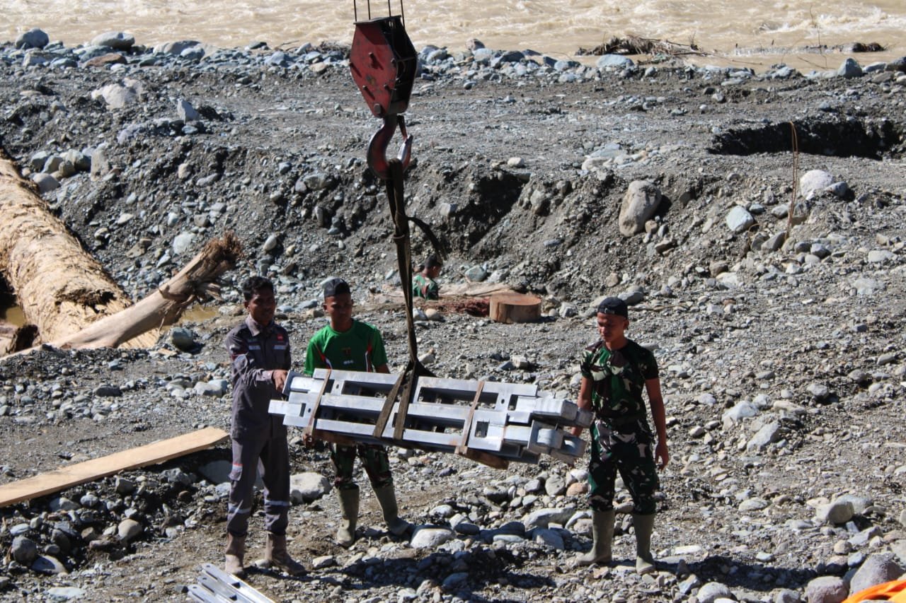 Rangka Jembatan Bailey selanjutnya akan segera dirangkai guna memulihkan akses vital masyarakat. Wilayah yang dikelilingi perbukitan ini sebelumnya mengalami keterisolasian akibat terputusnya akses transportasi pascabanjir.