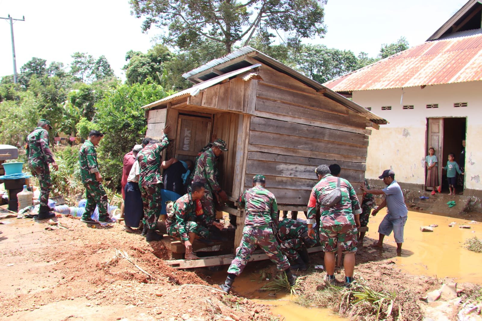 Babinsa bersama aparat pemerintah setempat dan masyarakat segera turun ke lokasi untuk membantu evakuasi, mengamankan barang-barang, serta memantau perkembangan debit air.