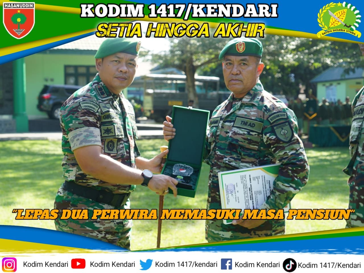 Kendari, 30 Januari 2023 – Kodim 1417/Kendari melaksanakan serangkaian acara resmi yang penuh makna, yakni penyerahan tugas dan pelepasan dua orang perwira TNI yang telah mengakhiri masa dinas aktif. Acara ini dipimpin oleh Dandim 1417/Kendari, Letkol Arm Danny A.P Girsang, S.Sos., M.Han, dan berlangsung di Makodim 1417/Kendari, yang berlokasi di Jalan Samratulangi, Kelurahan Kemaraya, Kecamatan Kendari Barat.