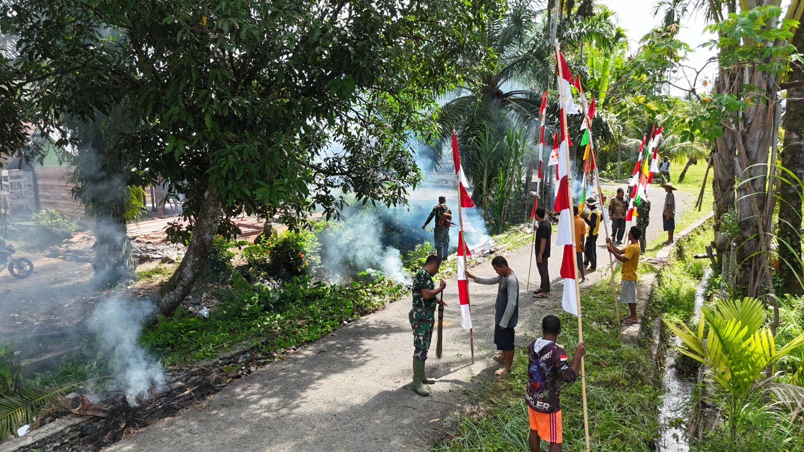 Umbul-umbul yang kini berdiri tegak di sepanjang jalan desa bukan hanya hiasan semata. Ia menjadi saksi perjalanan kebersamaan antara TNI dan masyarakat yang selama beberapa minggu terakhir saling bahu-membahu membangun desa.(0116).