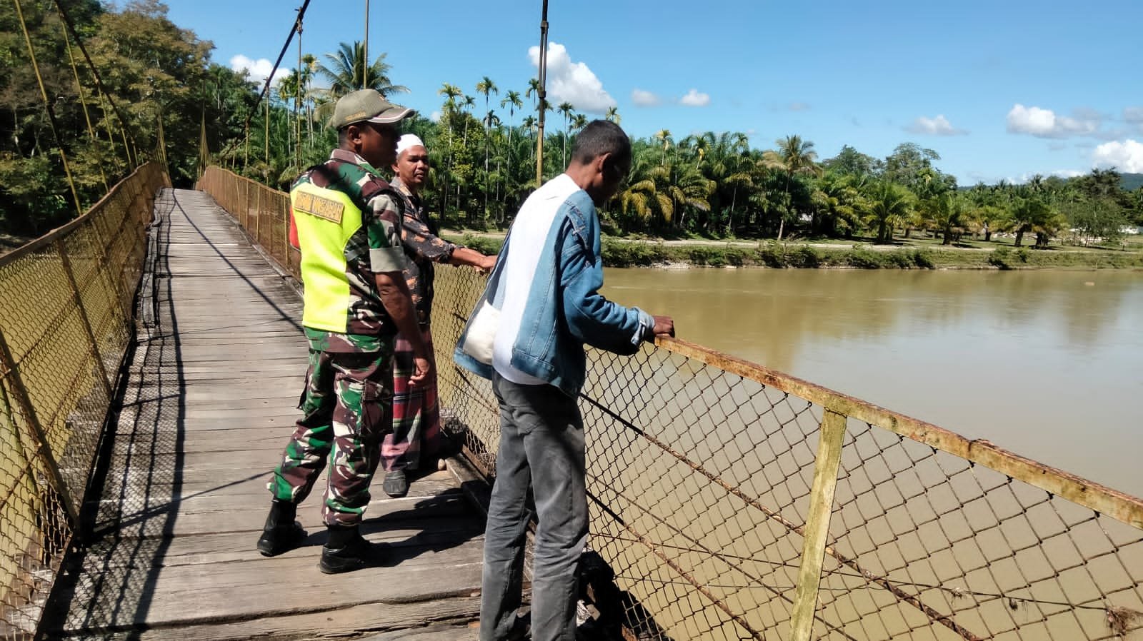 Babinsa Koramil 01/sungaimas Serda Yuslianto di sela sela Patroli Rutin yang di lakukan dengan warga desa untuk memantau aliran sungai yang setiap saat berubah dengan kondisi curah hujan yang tinggi