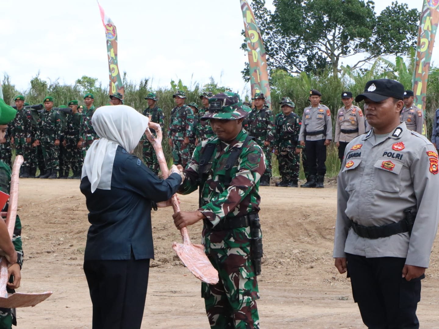 Kegiatan TMMD ini diawali dengan serangkaian upacara resmi yang mencakup laporan kesiapan program, penandatanganan naskah serah terima, dan penyerahan alat kerja, yang menandai dimulainya berbagai program pembangunan yang akan dilaksanakan di daerah tersebut.