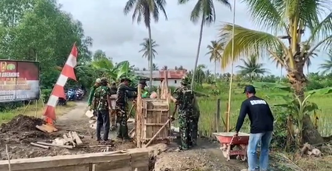 Wujud Kepedulian TNI, Sertu Salim Dampingi Warga Kerja Bakti Pengecoran Pondasi Pagar Jembatan