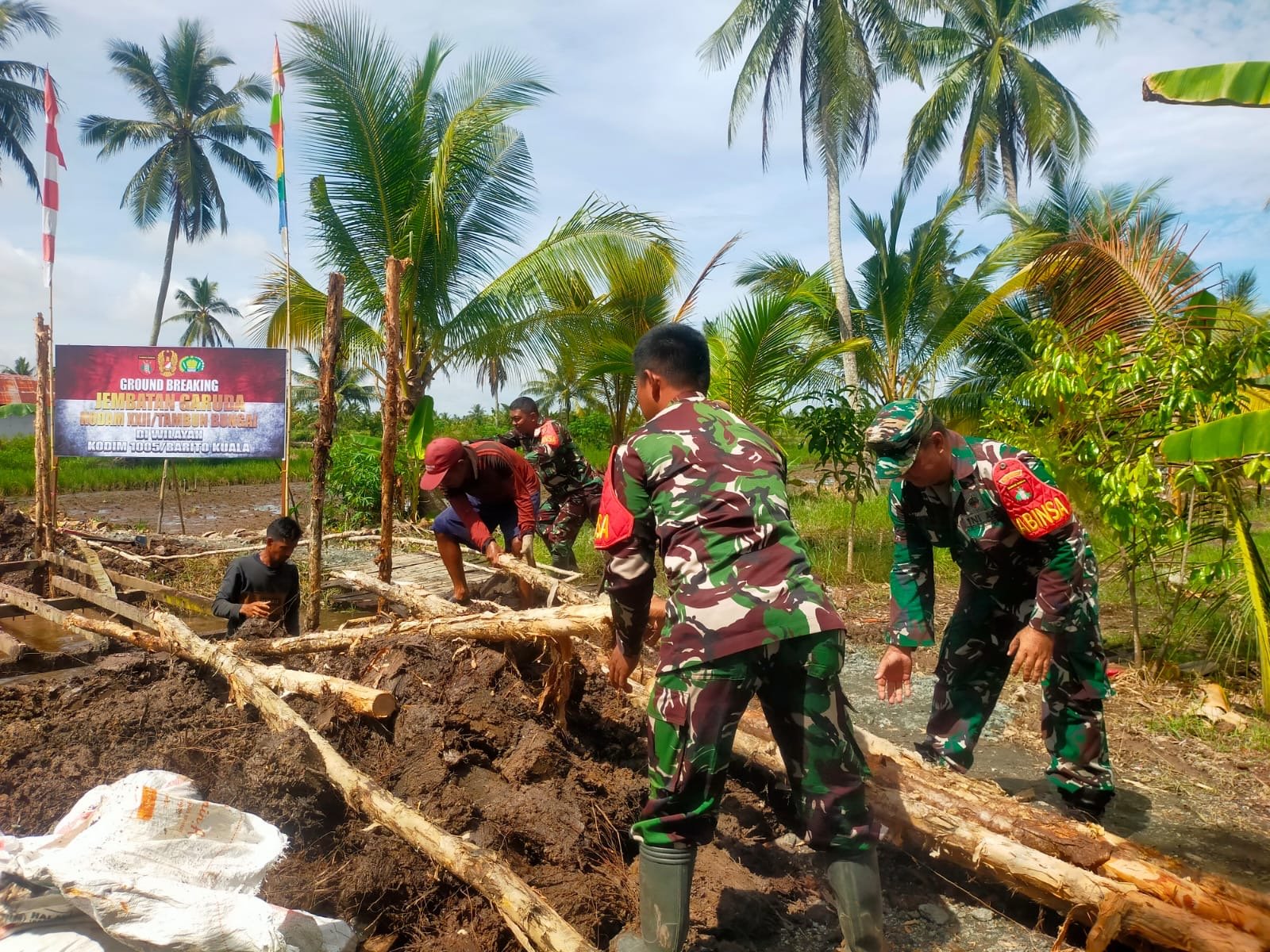 BARITO KUALA – Kodim 1005/Barito Kuala terus bergerak cepat dalam memacu progres pembangunan “Jembatan Garuda” yang berlokasi di Desa Tamban Bangun, RT 10, Kecamatan Tamban, Kabupaten Barito Kuala. Pada hari Sabtu, 11 April 2026, kegiatan konstruksi memasuki tahap yang sangat penting, yaitu pemasangan tiang galam sebagai penyangga utama jembatan tersebut.